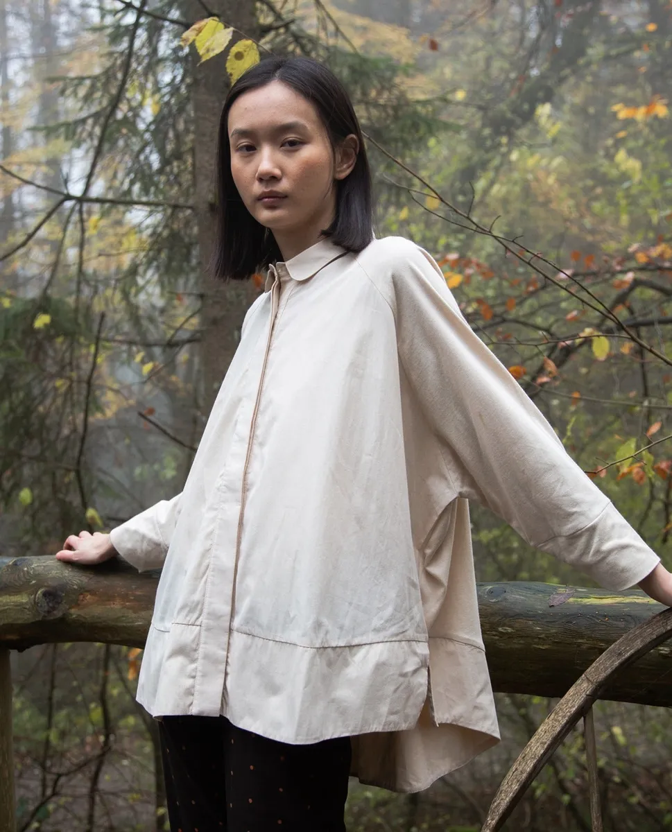 The Adella is an oversized batwing poplin shirt featuring a full length sleeve with jersey cuffs, a hidden button placket, and turn over collar. THINGS TO KNOW: - Made from 100% organic cotton - Made ethically in Portugal - Machine washable at 30 degrees C SIZE & FIT: Effy is 5'10" and wears Size Small. This style is an Oversized Fit. SUSTAINABILITY: Fabric Composition: 100% Organic CottonOrigin: Guimaraes, Portugal Spun/Woven Factory: ETEVIMOL Location: Barcelos, Portugal Dyed