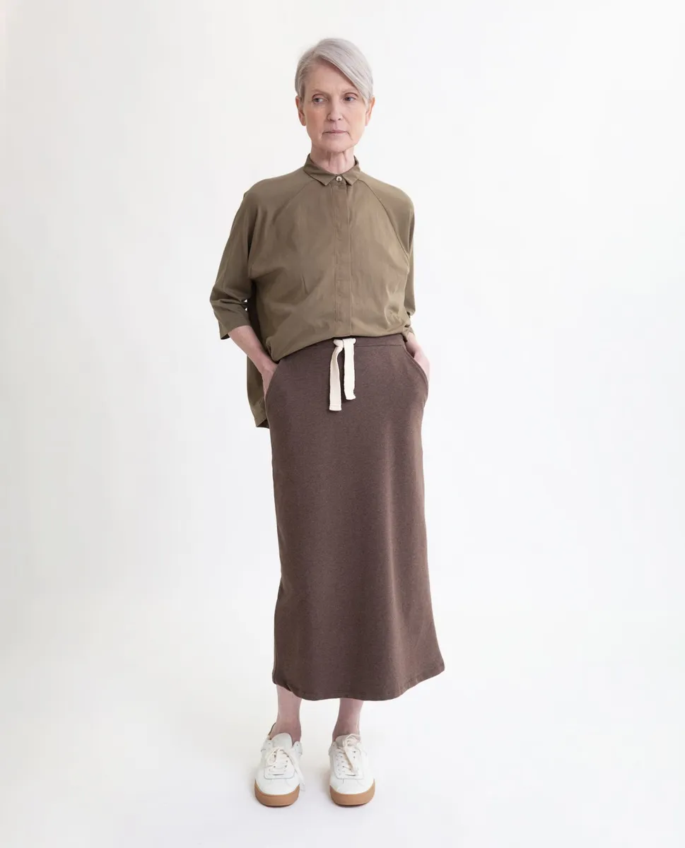 The Ana Skirt is a straight cut style feating an elasticated waist, pockets at the side seam and a drawstring tie at front. THINGS TO KNOW:- Made from 95% Organic Cotton, 5% Elastane- Made ethically in Portugal.- Machine washable at 30 degrees C SIZE & FIT: Lisskulla is 5'10" and wears a size Small.  Length of Size Small: 84cmThis style is a Classic Fit. SUSTAINABILITY:  Fabric Composition: 95% Organic Cotton, 5% ElastaneOrigin: Guimaraes, Portugal Spun/Woven Factory: ETEVIM