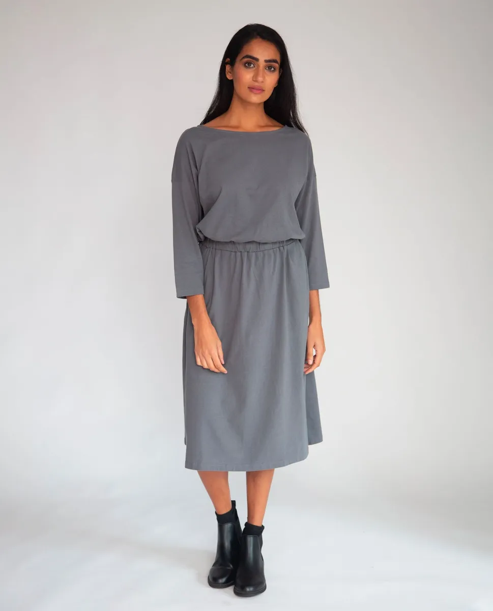 The Bellamy is a winter update of our popular Marissa Dress. Made from our super soft brushed organic cotton, the style features side pockets, a midi length hemline, elasticated waistband and a 3/4 length sleeve. THINGS TO KNOW:- Made from 100% Organic Cotton- Made ethically in Portugal- Machine washable. SIZE & FIT: This style is a Loose Fit. Please see size guide for more details.