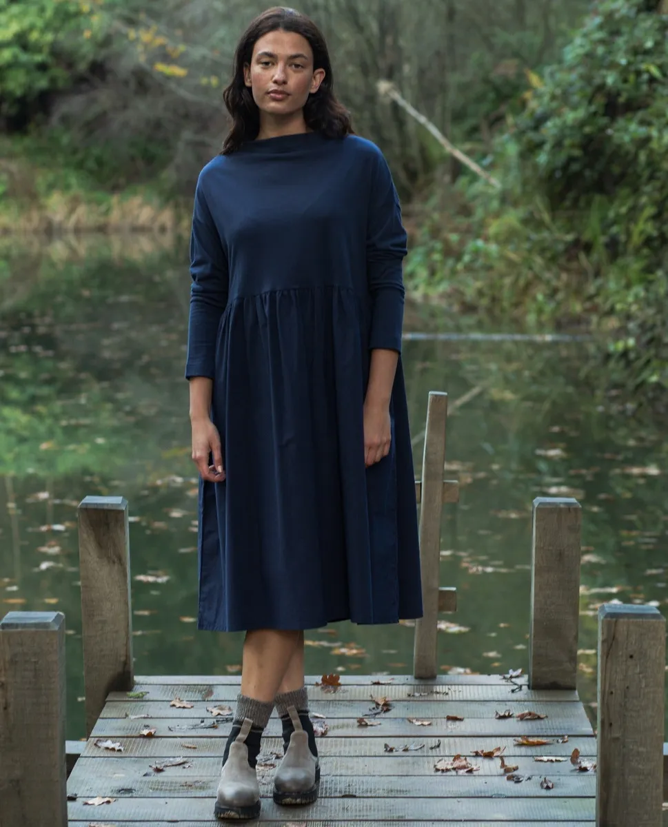 The Bramble is an oversized dress with a high slash neckline, full length sleeve and voluminous poplin skirt. Has pockets at the side seams. THINGS TO KNOW: - Made from 100% organic cotton - Made ethically in Portugal - Machine washable at 30 degrees C SIZE & FIT: Caitlin is 5'10" and wears Size Small. This style is an Oversized Fit. SUSTAINABILITY: Fabric Composition: 100% Organic Cotton Origin: Portugal Spun/Woven Factory: ETEVIMOL Location: Barcelos, Portugal Dyed Facto