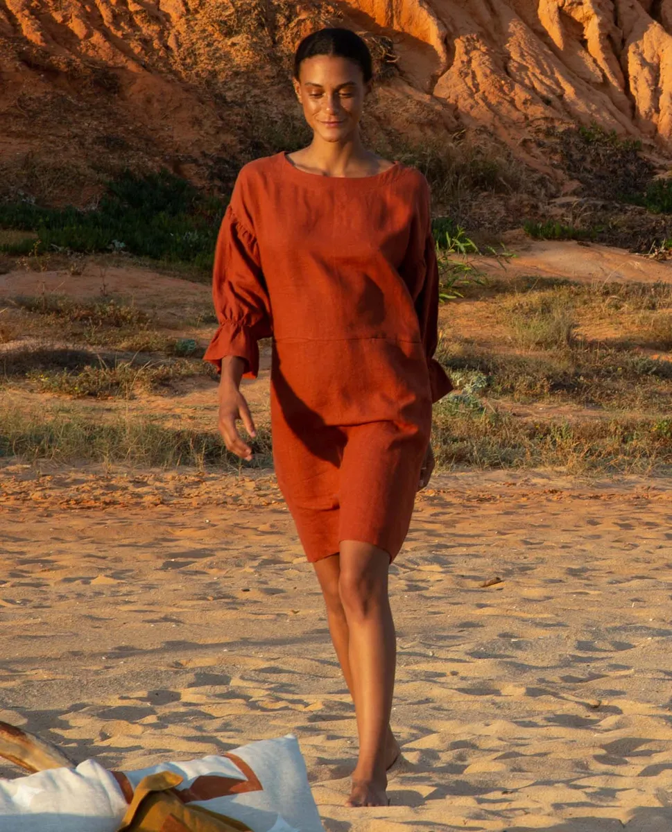 A sister style to a winter favourite Abigail - the Claudia-May dress features the same round neckline and voluminous cuffed sleeves. Enjoy discreet pockets at the front. THINGS TO KNOW: - Made from 100% Linen - Made ethically in Portugal - Machine washable SIZE & FIT: Model is 5'9" and wears size Small This style is an Oversized Fit