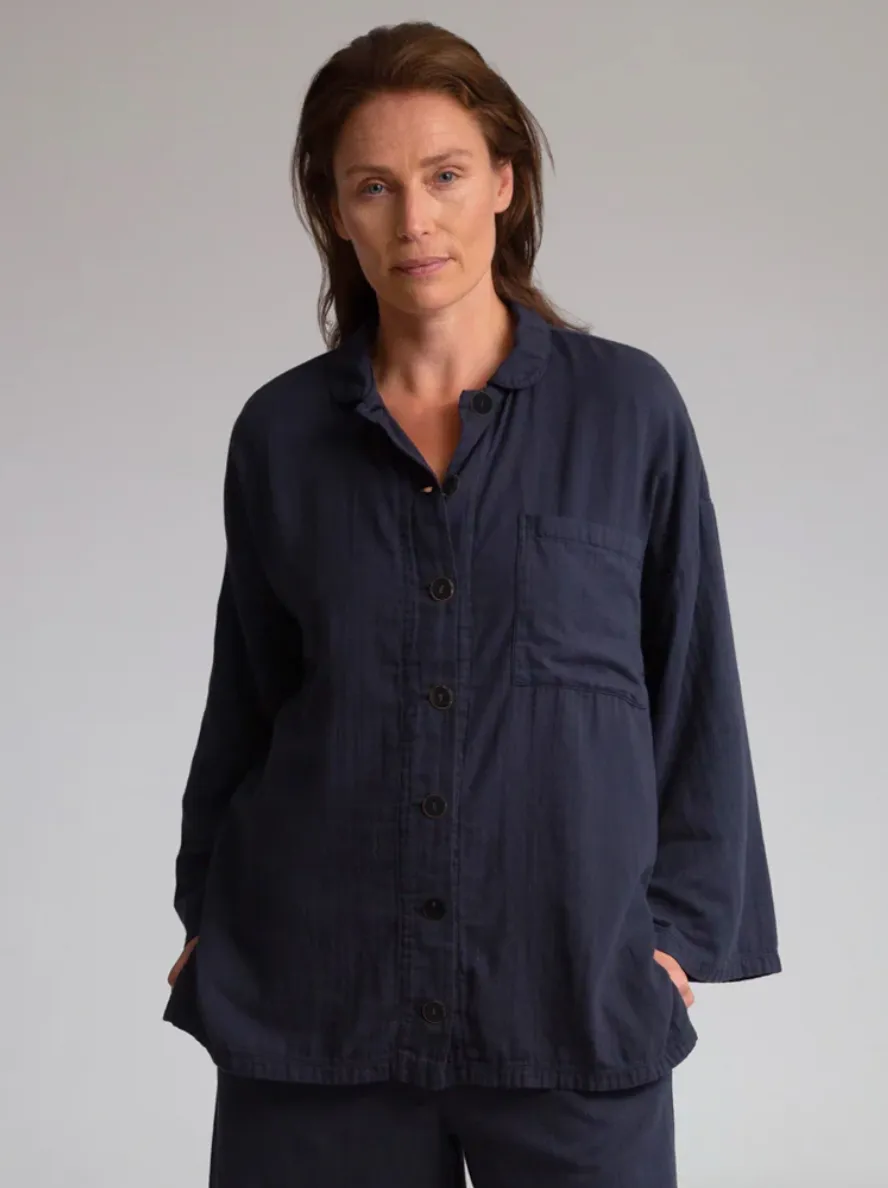 The Florrie is a traditional pyjama top made from luxuriously soft double layered cotton, with buttons and collar details at the front. THINGS TO KNOW:- Made from 100% organic cotton- Made ethically in Portugal SIZE & FIT: Shalke is 5'10' and wears Size Small. Length of garment: 69cm.This style is an Oversized fit. See size guide for more details. SUSTAINABILITY: Fabric Composition 100% Organic Cotton Certification Okeo-Tex Dyed Portugal / Clothius Factory Sewn and Finished