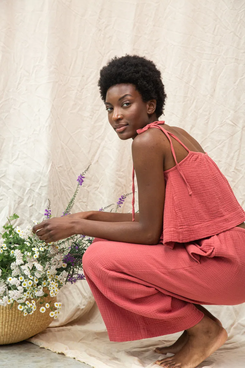 The Janis top features a square neck, tie top straps and a lower scooped back neckline. It sits cropped, with a swingy A-line shape and is crafted from double gauze organic cotton for a relaxed, textured feel. Pair with the Sawyer trousers for a co-ordinated set. Made from 100% organic cotton Made ethically in Portugal Machine washable at 30 degrees Celsius SIZE & FIT This style is a Classic Fit. Naomy is 5'9" and wears a size small. See size guide for more details. SUSTAINABILITY: Fa