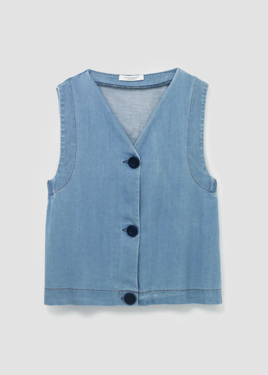 The Jovie-Leigh is a loose-fitting button down vest crafted from 100% organic cotton denim, featuring a V-neck, elasticated detail under the arm and three sustainable corozo buttons. Style with the Paola-Leigh shorts, or the Evora-Leigh trousers for a matching set. Made from 100% organic cotton. Buttons are sustainable corozo. Made ethically in Portugal. Machine washable. SIZE & FIT This style is a Classic Fit. See size guide for more details. SUSTAINABILITY: Fabric: 100% Organic Cotton