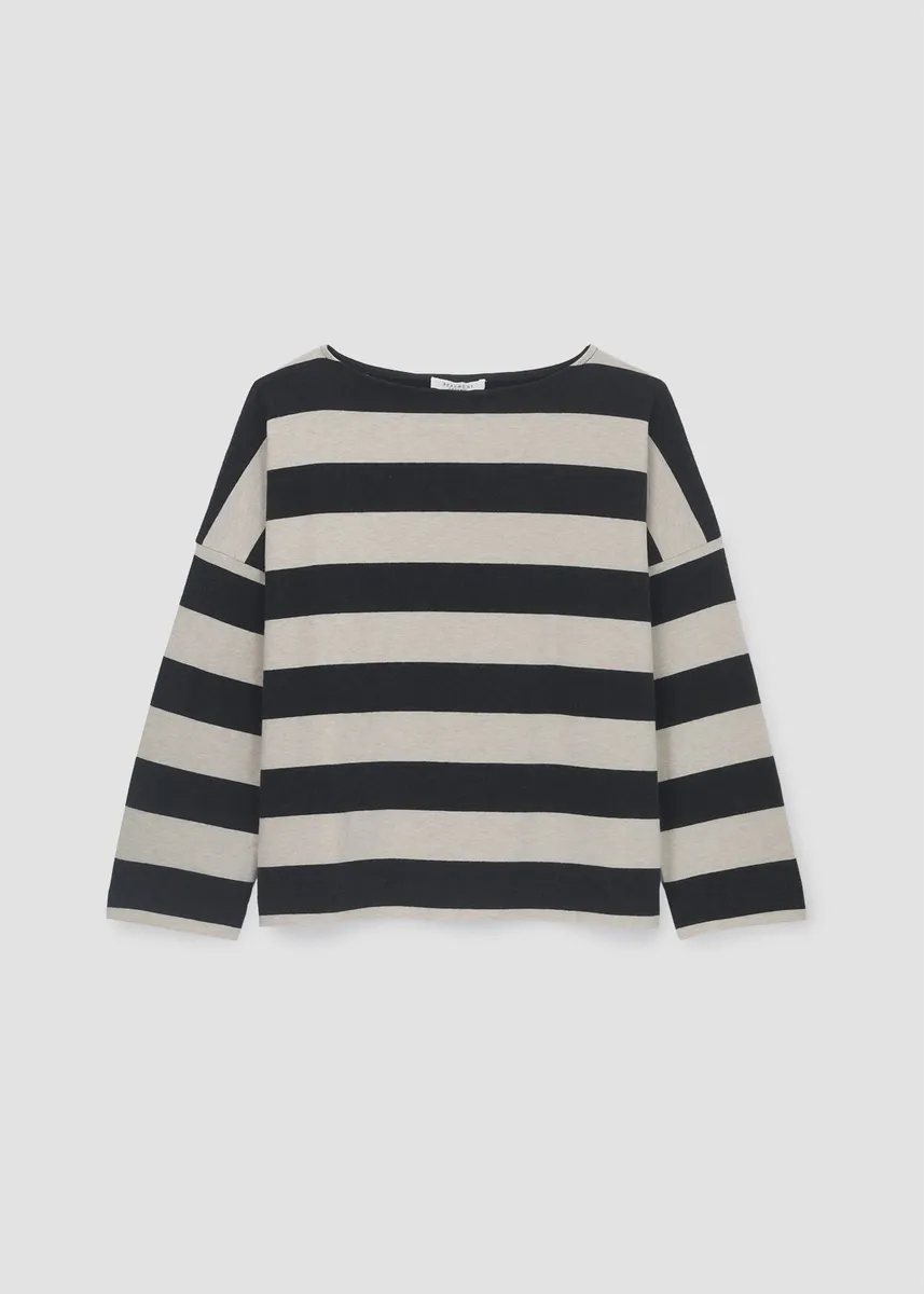 The Leia-Sue is a boxy cut top with a boat neckline, 3/4 length sleeve and drop shoulder. Perfect for layering and made from our super soft 100% organic cotton jersey. Made from 100% organic cotton. Made ethically in Portugal. Machine washable at 30C. SIZE & FIT Hailey is 5'9" and wears a size Small. This style is a Classic Fit. SUSTAINABILITY: Fabric Composition: 100% Organic CottonOrigin: Guimaraes, Portugal Spun/Woven Factory: Etevimol, Braga, Portugal Dyed Factory: Perfil Cro