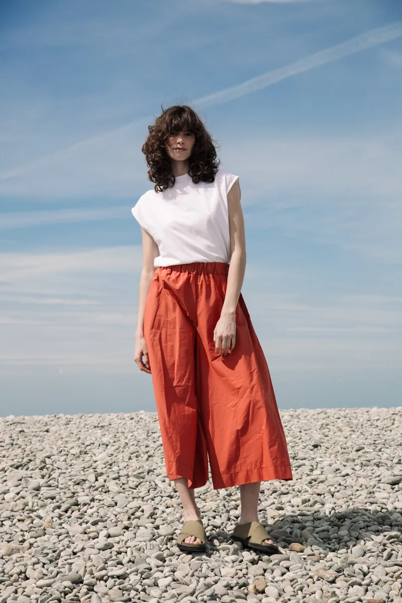 The Mazu Trousers are a super wide fit culotte style with side pockets and an elasticated waistband. Crafted from 100% Organic Cotton poplin for a crisp cool feel. Things to know: - Made from 100% Organic Cotton.- Made ethically in Portugal.- Machine washable. SIZE & FIT: This style is a Classic Fit. Karla is 5'10" and wears a size small. See size guide for more details. SUSTAINABILITY: Fabric Composition: 100% Organic Cotton Origin: Guimaraes, Portugal Spun/Woven Factory: ETEVIM