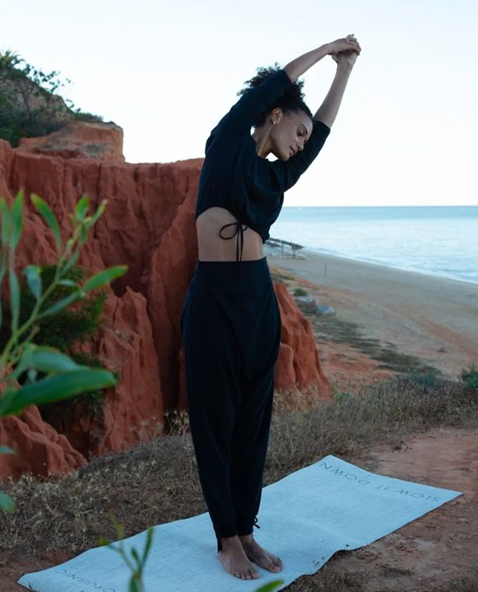 The Odina trouser is a new style for SS23. Made from our super soft organic cotton and easy to move in whether for a workout or everyday wear. It is fitted at the hip to stay in place during yoga and the harem drop crotch provides easy movement. Features delicate tie fastening detailing on cuffs and waistband. THINGS TO KNOW: - Made from 95% Organic Cotton, 5% Elastane - Made ethically in Portugal - Machine washable SIZE & FIT: Model is 5'9" and wears size Small This style a Classic Fit