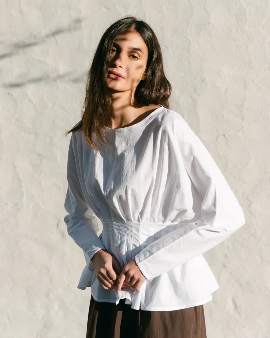 New for AW20, the Raquel is structured cotton and tencel top. Featuring an elegant gathered waist detail, back zip, and a keyhole button fastening. THINGS TO KNOW:- Made from 100% Organic Cotton- Made ethically in Portugal- Machine washable. SIZE & FIT: This style is a Slim Fit. Please see size guide for more details.