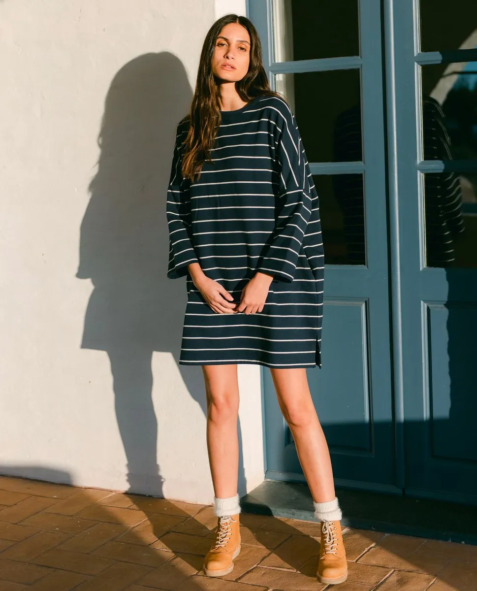 Our classic Sarasi sweater dress is updated with a subtle tonal stripes. Featuring a drop shoulder, round neck and boxy fit, the Sarasi-Sue is made from our signature heavy weight organic cotton which is warm and super soft against the skin. THINGS TO KNOW: - Made from 95% Organic Cotton, 5% Elastane- Made ethically in Portugal- Machine washable SIZE & FIT: This style an Oversized Fit. Please see size guide for more details.