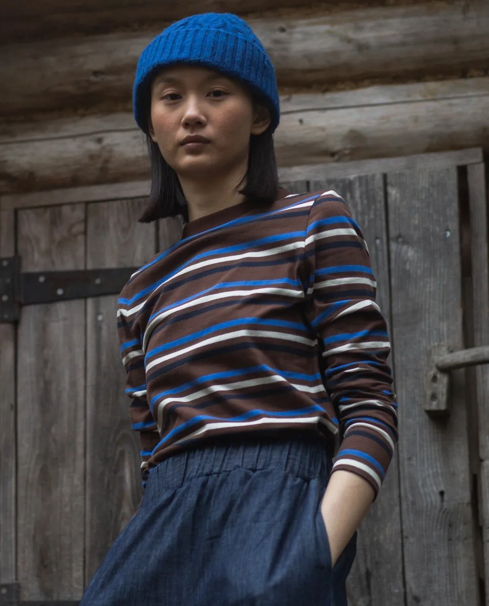 Our classic Shoba T-shirt is back for AW23 in two new seasonal colourways. Featuring a ribbed crew neck, long sleeve and slim fit, it's the perfect layering piece for transitioning from Autumn to Winter. THINGS TO KNOW: - Made from 100% organic cotton - Made ethically in Portugal - Machine washable at 30 degrees C SIZE & FIT: Effy is 5'10" and wears Size Small. This style is Classic Fit. SUSTAINABILITY: Fabric Composition: 100% Organic Cotton Origin: Portugal Spun/Woven Factory: