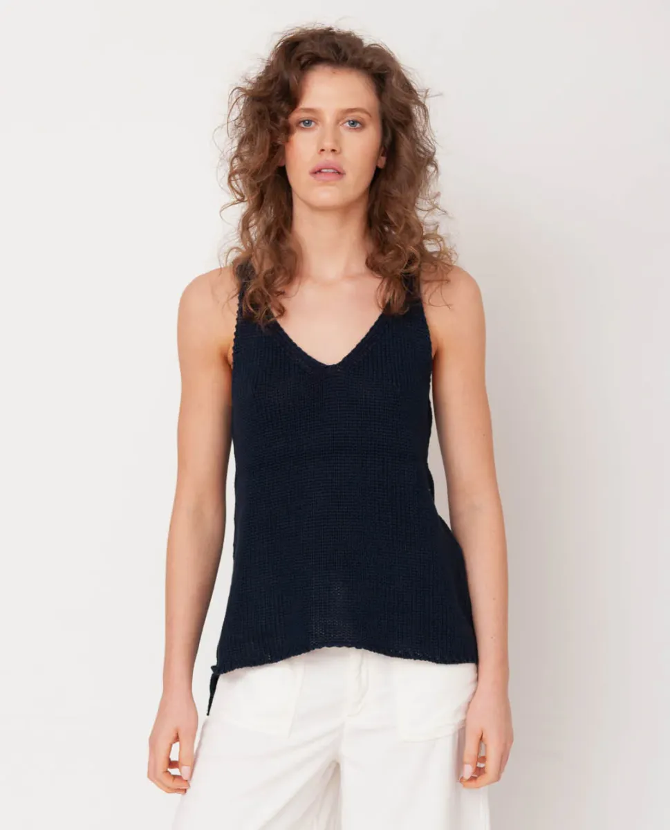 The Stella is a luxuriously soft knitted vest made from organic cotton. Features a V-neck front and back with small split details. THINGS TO KNOW:- Made from 100% Organic Cotton.- Made ethically in Portugal.- Machine washable. SIZE & FIT: Model is 5ft 9.5" size 8 and wears a size S.This style is a Loose Fit. See size guide for more details.