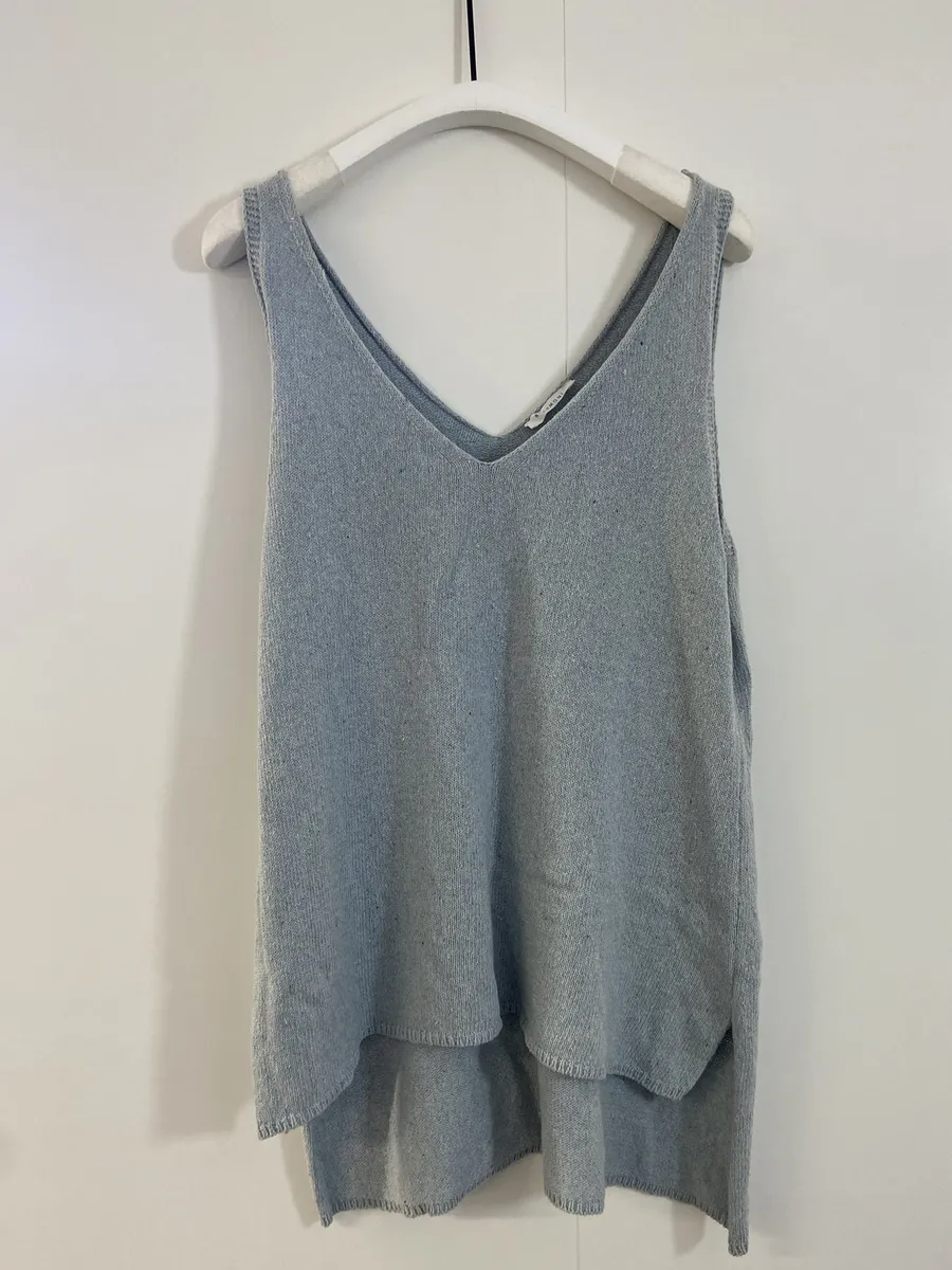 The Stella is a luxuriously soft knitted vest made from recycled cotton. Features a V-neck front and back with side split details. CONDITION Very good THINGS TO KNOW:- Made from 95% recycled denim cotton, 5% Other Fibres.- Made ethically in Portugal.- Machine washable. SIZE & FIT: Model is 5'8". Length of garment (Small) is: 59cmThis style is a Classic Fit.See size guide for more details. SUSTAINABILITY: Fabric 95% Recycled Cotton, 5% Other Fibres. Certification Recycled Clai