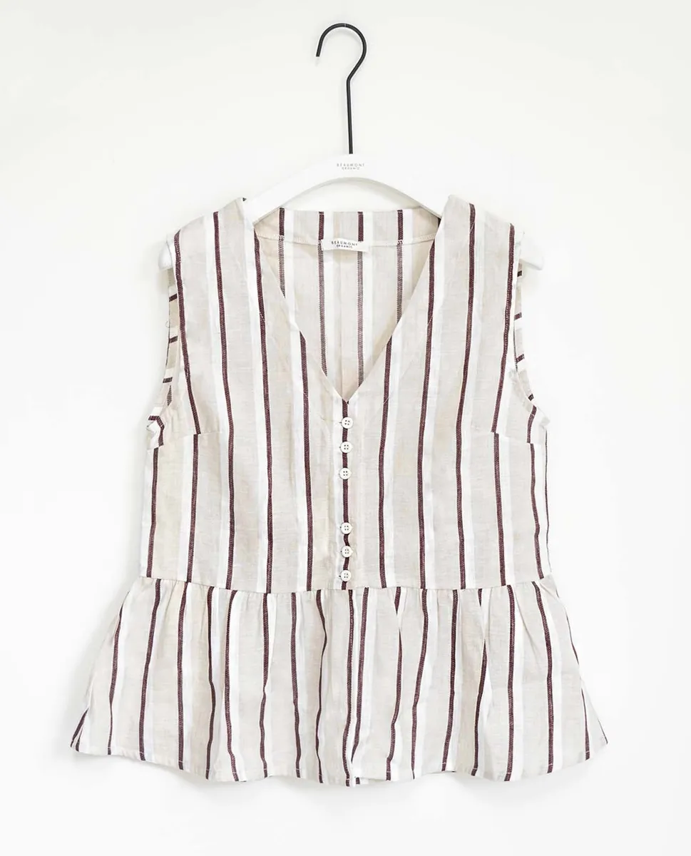 The Tamsin-Sue is a new style for spring. Enjoy this V-neck blouse with a button-down front and soft gathered detailing.     THINGS TO KNOW:- Made from 52% Linen, 48% Cotton- Buttons are made from a sustainable nutshell.- Made ethically in Portugal- Machine washable. SIZE & FIT: Model is 5' 8". This style is a Classic Fit. See size guide for more details.