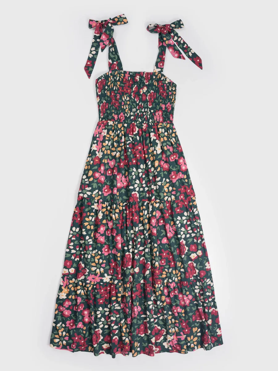 A cheerful riot of colors and blooms. A little wild, a lot charming. Meet your new summer obsession. This flowy maxi dress is as fun to wear as it is to style. The extra-stretchy smocked bodice flexes and fits every curve without fussing — no zippers, no adjusting, just put it on and go. Elegantly topped with adjustable ribbon ties you can wear your way. Tie the bows high or low, at the shoulders or across the chest, loose and flowy or snug and secure, it's a totally customizable look that's