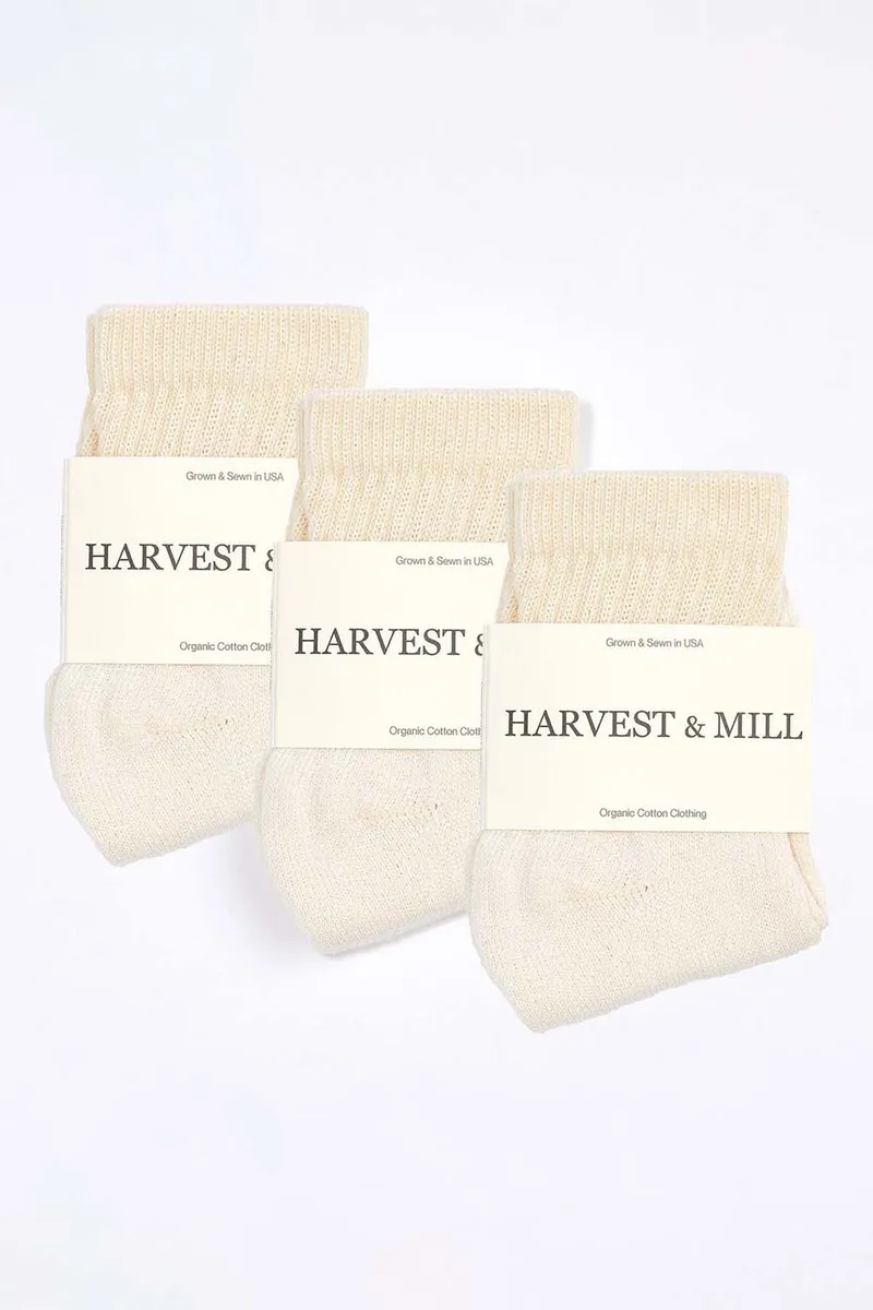 These socks are made from natural-white organic cotton. There are no dyes or bleaches used on these socks. Natural-white cotton is creamier in tone than stark bleached white. Ankle socks reach just above your ankle. 3 pairs included. Origins: Organic cotton grown in USA, spun in USA, knit in USA. Color: Made with natural-white cotton. Sizing: Medium (men’s US size 7.5-9.5), Large (men’s US size 10-12.5) and X-Large (men’s US 13-16) Care: Wash cold. Dry low. Content: 88% organic cotton 10% stret