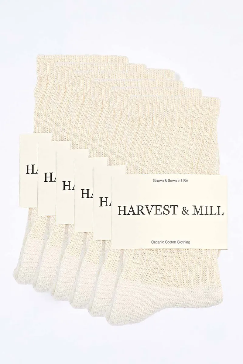 These socks are made from natural-white organic cotton. There are no dyes or bleaches used on these socks. Natural-white cotton is creamier in tone than stark bleached white. Crew socks reach your mid-calf. 6 pairs included. Origins: Organic cotton grown in USA, spun in USA, knit in USA. Color: Made with natural-white cotton. Sizing: Small (women’s US size 5-7), Medium (women’s US size 7-10) and Large (women’s US size 10.5-12) Care: Wash cold. Dry low. Content: 88% organic cotton 10% stretch ny