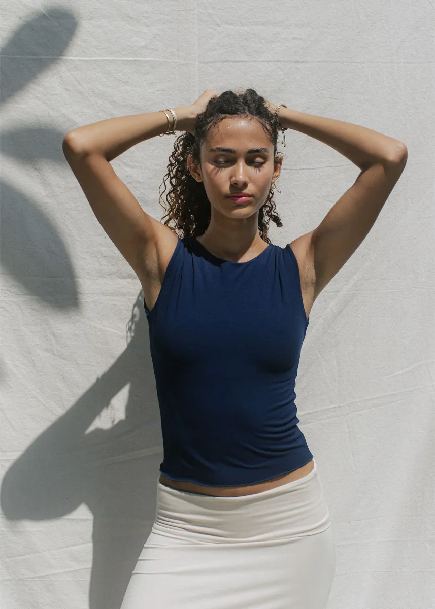 Our new Layla Tank is our latest favourite, perfect for both practice and daily life. Crafted from our signature plant viscose fabric, it feels like a second skin, ensuring comfort and ease throughout your day. This new design features a built-in bra for support, complemented by a flattering boat neckline that subtly highlights your décolletage. Its length is thoughtfully designed to gracefully cover the belly, enhancing its appeal and functionality.