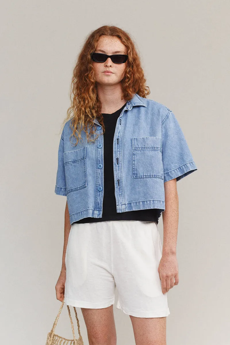 Super boxy, avant-garde shape, this short sleeve top is crafted from soft hemp denim. Its perfect cropped length pairs beautifully with high-waisted bottoms, making it a standout piece on its own or layered over a sleek tank.