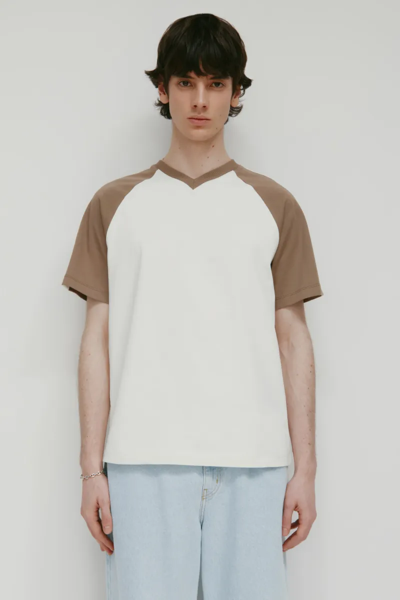A sport-inspired staple, the Men’s Varsity V-Neck is cut in an easy fit from a midweight 100% Egyptian cotton jersey. Designed with raglan colorblocking and a contrast stripe along the shoulder. Soft yet structured, it’s designed for everyday wear with a subtle athletic edge.