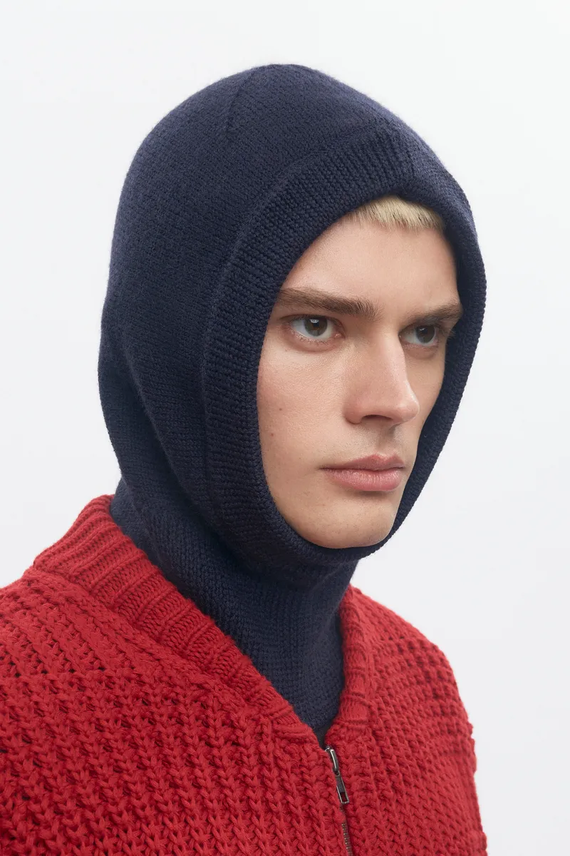 Knit from 100% merino wool, this minimalist knit balaclava sits slightly off the face for comfort and airflow. Warm yet breathable with an extended neck for coverage—wear it up for full protection or pull it down as a hood/neck warmer; slim enough to layer under jackets.
