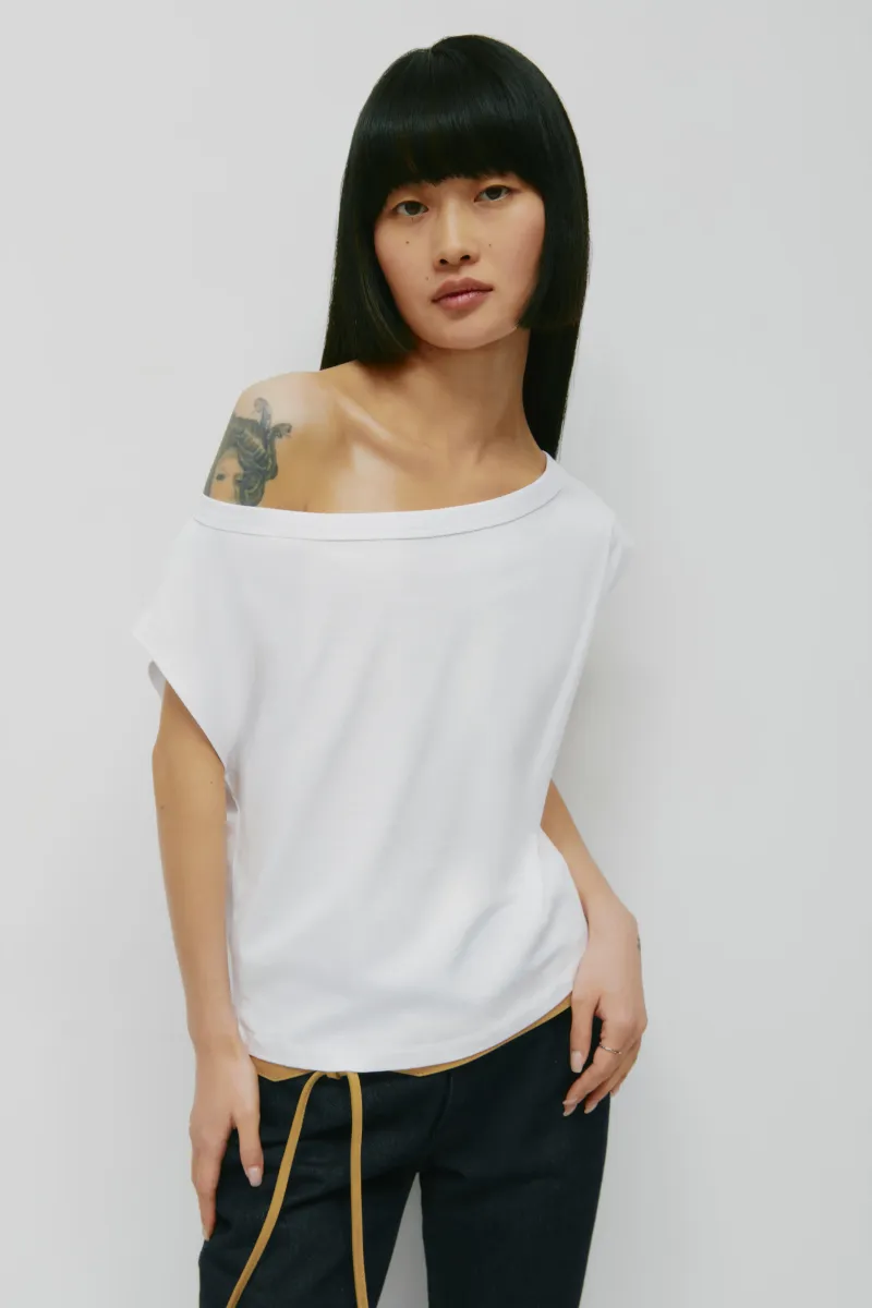 The Off-Shoulder Tee is a lightweight essential, crafted from 100% Egyptian cotton for a soft, breathable feel. Designed with a flowy fit and a versatile one-shoulder silhouette, it drapes beautifully for effortless styling.