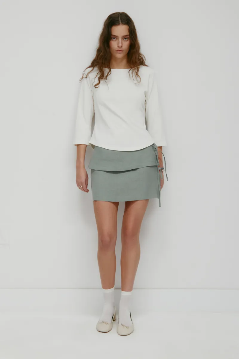 The Sila Linen Tie Skirt is a lightweight, breathable mini skirt made from 100% linen with a natural, lived-in feel. Designed with a low-rise fit and a foldover waist, it creates an easy layered effect that sits relaxed on the hip. Double linen ties at the side knot loosely for a soft, adjustable finish, with a concealed side zip underneath for a clean line.