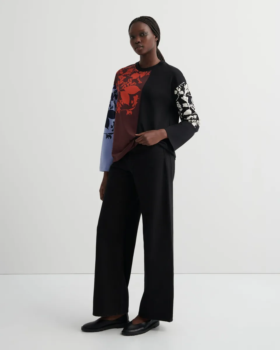 Relaxed. Playful. Artful. Crafted from contrasting panels in a playful patchwork design, with a long-sleeve, boxy silhouette and drop shoulders. Finished with a screen-printed pressed foliage artwork for a subtle, artistic touch. A touch of art for the everyday.