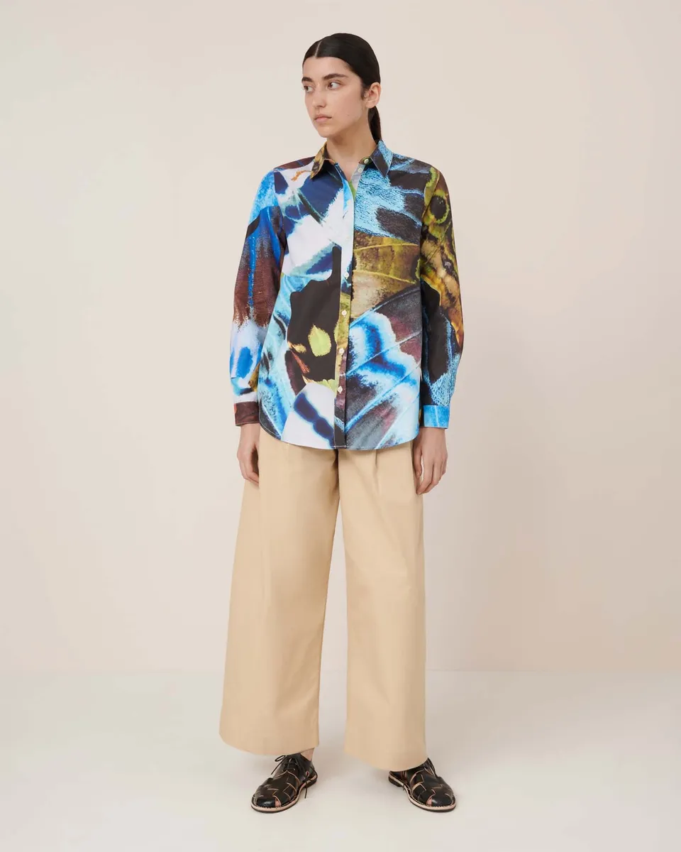 The Classic Shirt is a timeless long sleeve style, featuring a front shell button closure, shell buttoned cuffs, and a curved hem. Designed with a standard fit, it is crafted from organic cotton poplin shirting and showcases our statement Monarch print — a design inspired by the intricate textures and vibrant colours of butterfly wings. All Fairtrade organic cotton. All plastic-free. Please note that each individual tee is unique and the print placement may differ from the image shown on our web