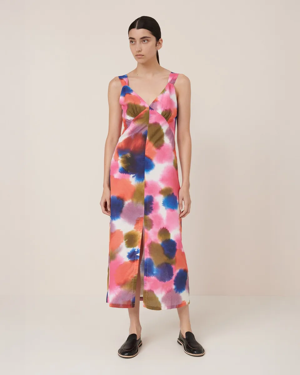 The Fluidity Dress embodies elegance with a beautifully cut, fitted silhouette, featuring a flattering v-neckline and midi-length hem. Made from soft organic cotton voile, this dress showcases our hand-painted watercolour print. Designed with a standard fit, it includes a front split for added ease and movement. A perfect occasion-wear style. All Fairtrade organic cotton. All plastic-free.