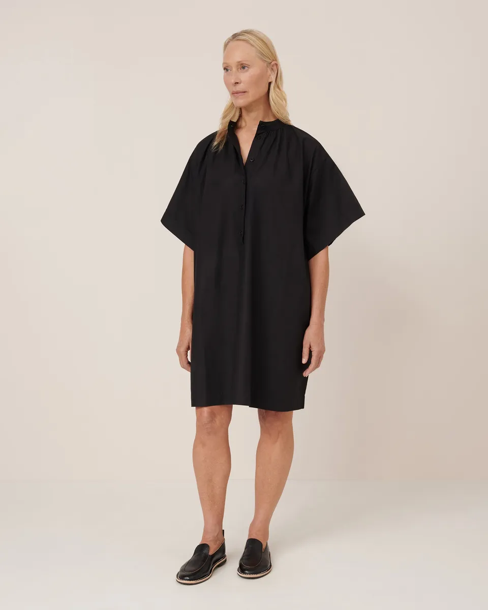 Crafted from a crisp organic cotton poplin, the Gallery Dress has an oversized fit with boxy, deep-cut sleeves, creating its bold silhouette. The softly gathered neckline is beautifully finished with a shell button placket. Ending just above the knee, the dress has inseam pockets for extra practicality. All Fairtrade organic cotton. All plastic-free.