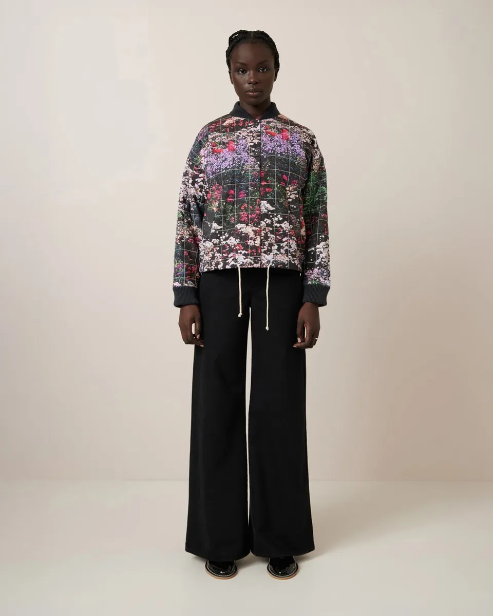 A capsule collection that turns surplus into special. A quilted bomber style jacket made from organic cotton utilising our past season Garden Book and Hazy Floral printed poplin. Jacket 05 features a ribbed knit collar and cuffs with a Tagua nut button closure through the front. It has a relaxed fit with a drop shoulder and outer angled pockets. Customise the fit with the cotton drawcord at the hem. All Fairtrade organic cotton. All plastic-free.