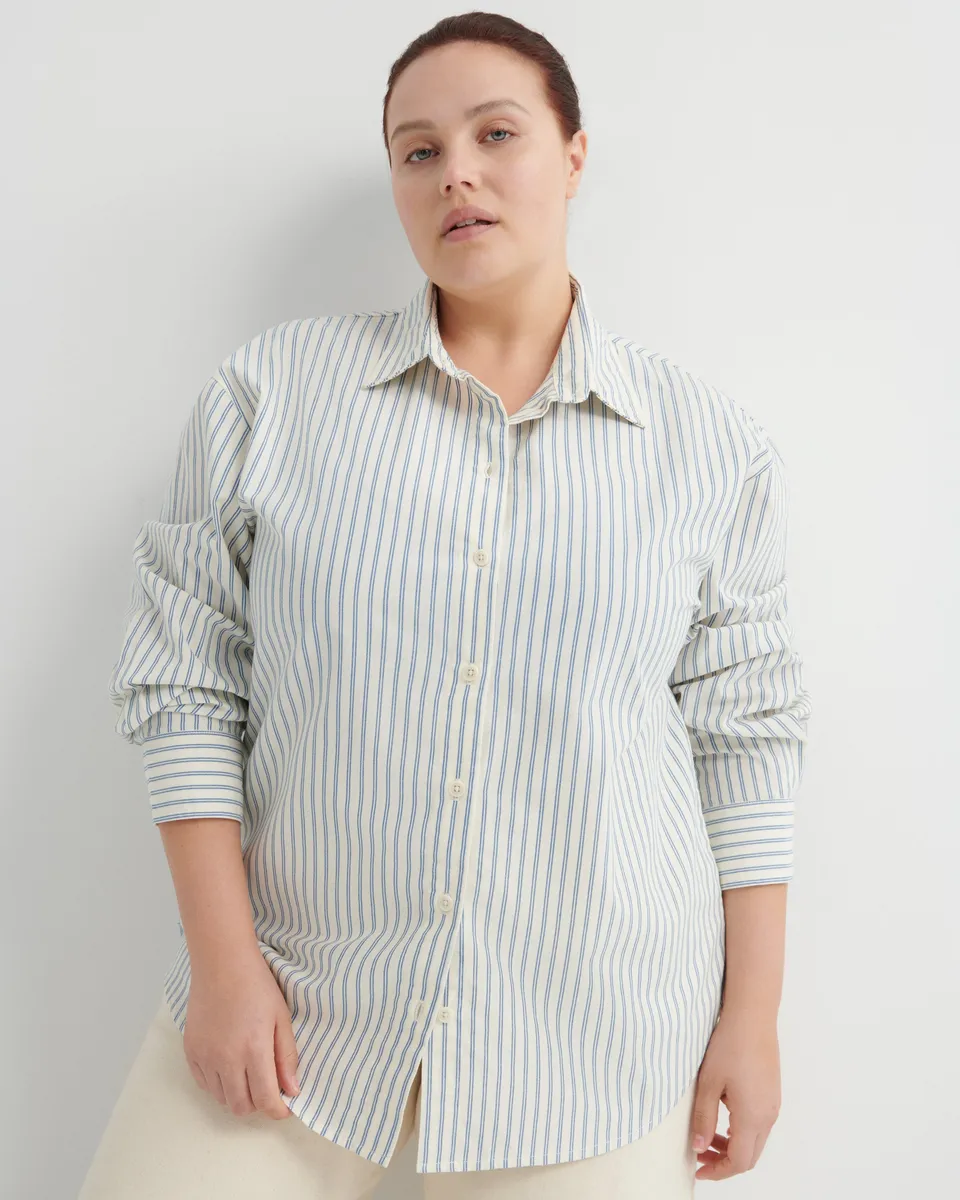 Effortless. Classic. Striped. The Maker Shirt is an easy-wearing style with classic shirting details including a traditional collar, button-up cuffs, and nut button fastenings through the front. A relaxed fit and dropped shoulder enhances the laid-back silhouette. Pairs perfectly with our Fold Skirt. An artful touch.