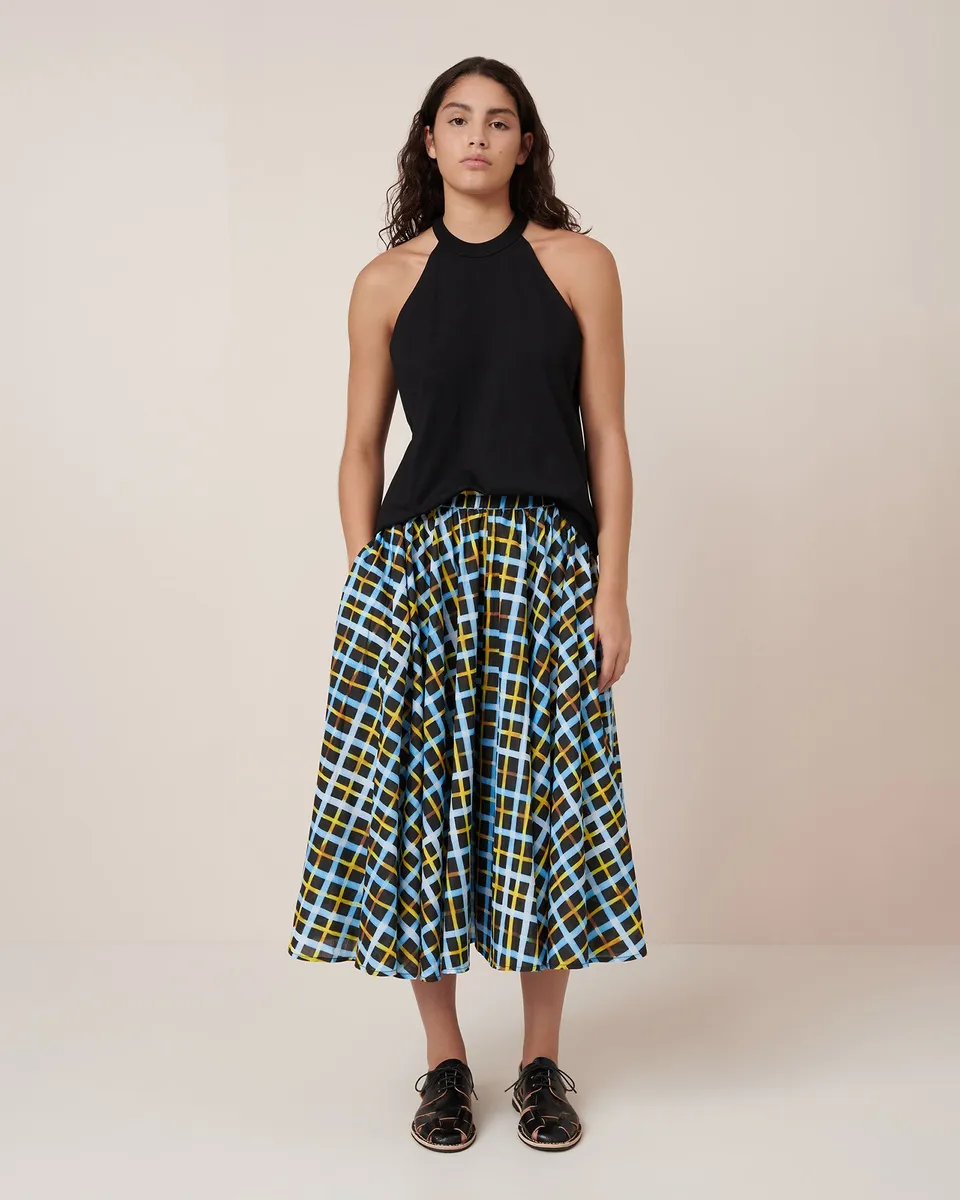 Defined by its voluminous gathers, the Motion Skirt has a relaxed fit that sits high rise with a comfortable elastic waistband. Finished with practical side seam pockets, it falls to ankle length. Crafted from light-weight organic cotton voile in our Neon tartan print — a handpainted design with bold brushstrokes and vibrant pops of yellow. All Fairtrade organic cotton. All plastic-free.