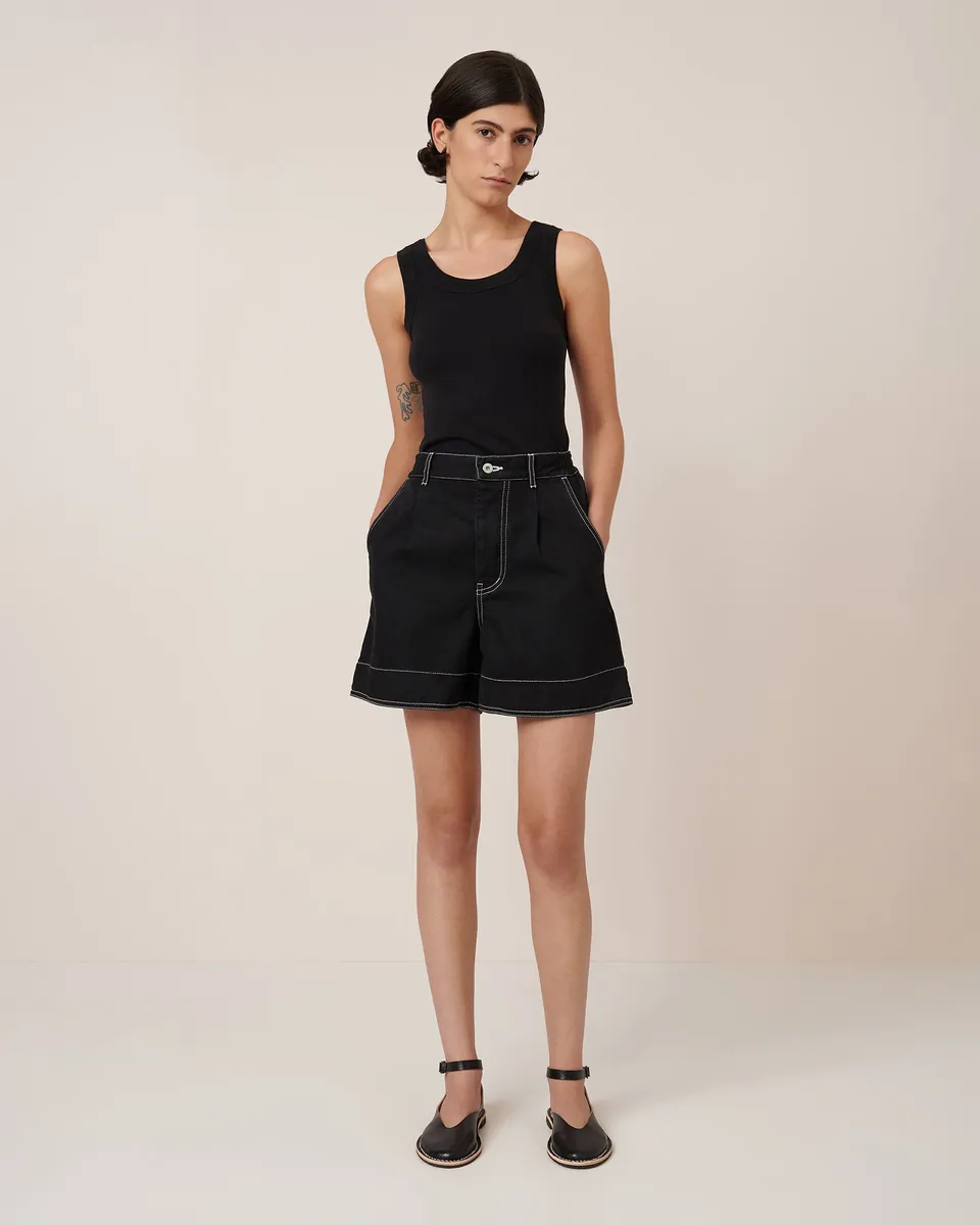 A mid-rise denim short that ends just above the knee, featuring an elastic waistband for a comfortable fit and contrast topstitching throughout. The shorts have front pleats, back patch pockets, and are fastened with nickel-free tacks in a concealed front fly. All Fairtrade organic cotton. All plastic-free.