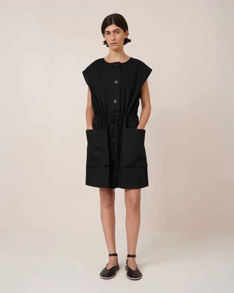 The Parker Dress draws inspiration from utilitarian workwear. Crafted from soft organic cotton twill, it features oversized front pockets and back pleating for a sculptural touch. The cotton drawcord at the waist allows for versatile styling, cinching in for added shape or left loose for an oversized fit. Finished with large nut buttons that echo outerwear detailing, this dress sits just above the knee. All Fairtrade organic cotton. All plastic-free.