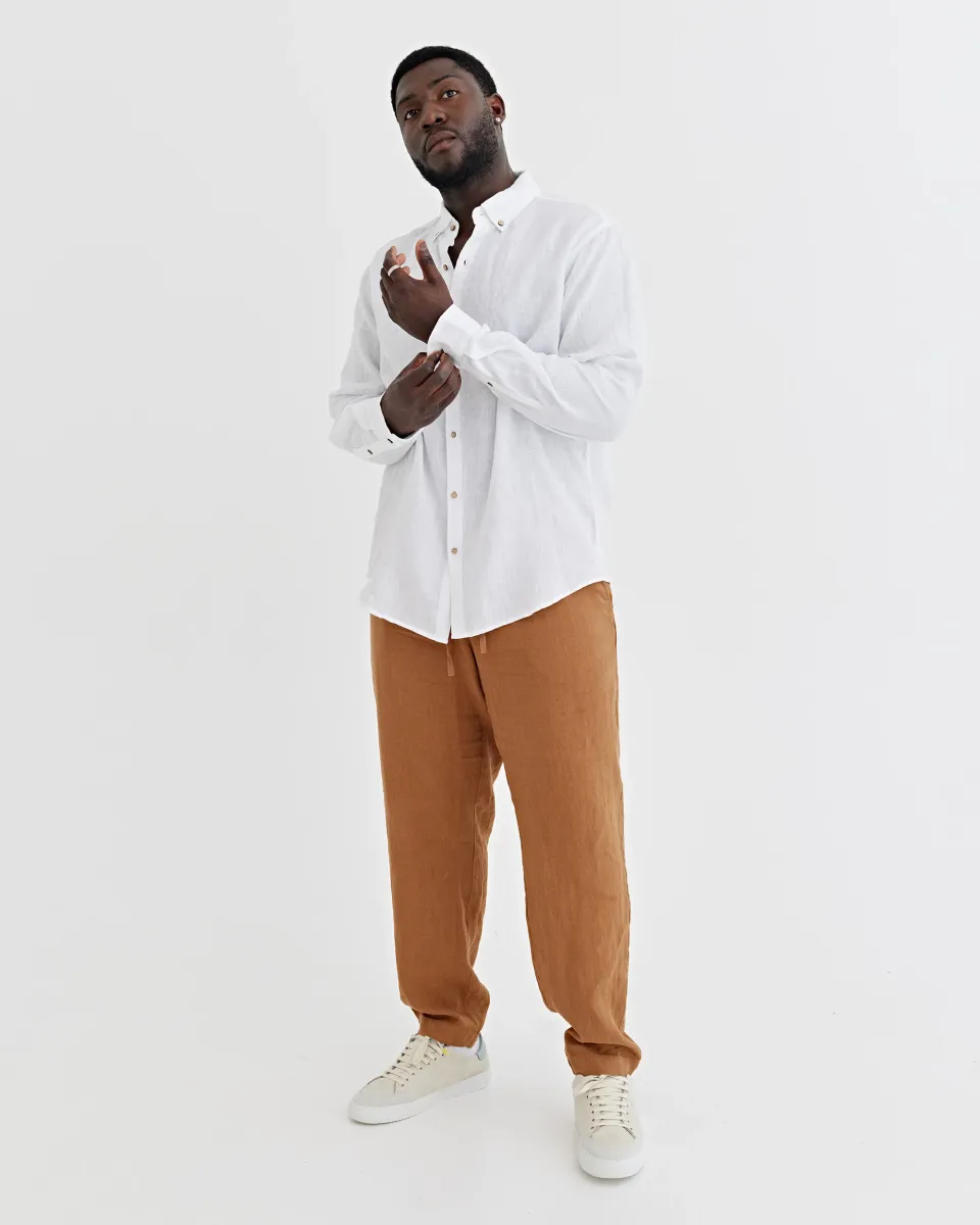 Men's linen pants available in various colors. Featuring an elastic drawstring waist and two side pockets, these linen trousers are comfortable and versatile. The tapered fit makes them look elegant when worn loose or rolled up. Lightweight and breathable, they are perfect for hot summer days and pair well with linen shirts and blazers.• Medium weight linen (approx. 200 gsm) Please note that due to the many variations in monitors and browsers, actual colors may vary.