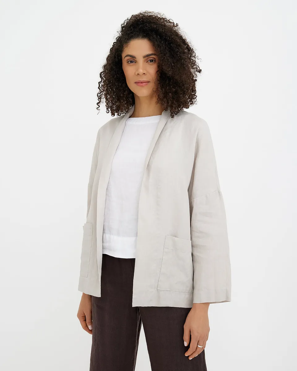 Natural Flax linen jacket LOS ANGELES is an open-front women’s jacket made from 100% European flax linen in a breathable midweight fabric. The relaxed straight silhouette is designed for easy layering over dresses and tops. Long sleeves and front patch pockets provide function while maintaining a clean, balanced outline. Color & Feel Natural Flax is an undyed oatmeal tone that reflects the natural color of flax fibers. It may appear slightly warmer indoors and more neutral in daylight. Subtl
