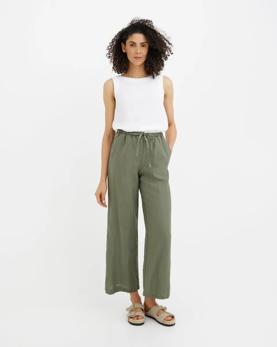 Linen pants CURACAO in Mist green are made from 100% European flax linen in a breathable midweight fabric. The relaxed, full-length silhouette features a mid rise and loose straight legs for ease of movement. An elastic waistband with an adjustable drawstring allows flexible shaping at the waist. Color & Feel Mist Green is a muted earthy green that appears lighter in daylight and slightly deeper indoors. The fabric provides everyday coverage and softens gradually with washing while maintaini