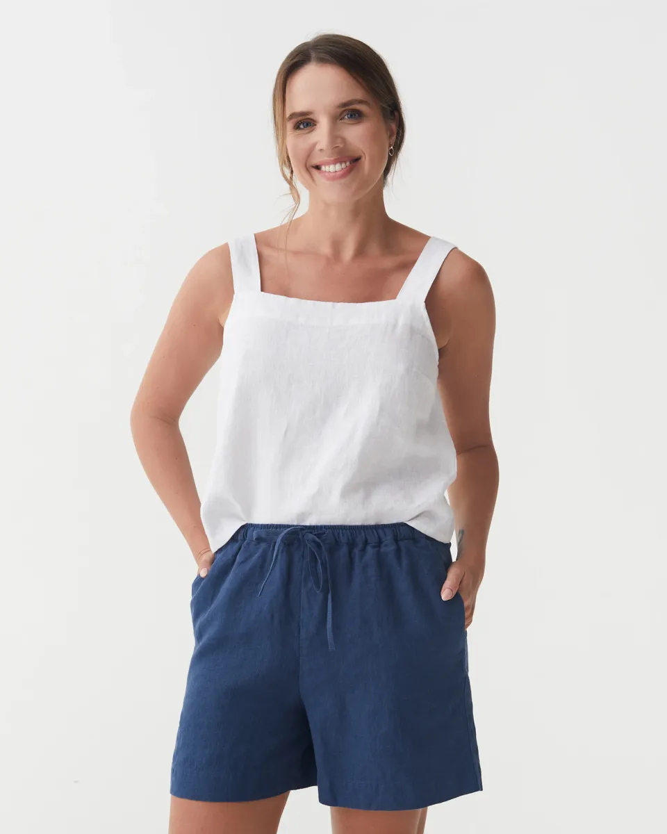 The Linen Shorts ERIE in Deep Navy Blue blend style and comfort for warm days. Featuring a relaxed silhouette, elastic waistband, and adjustable drawstring, they offer a breathable feel and effortless wearability. Made from midweight linen, these shorts provide ease of movement, making them ideal for casual outings, lounging, or pairing with a linen shirt for a coordinated summer look. • Fitted• Short length