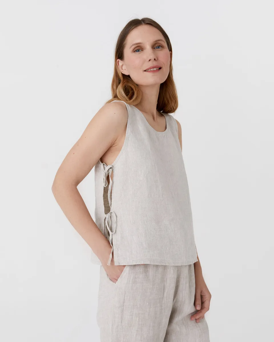 Enjoy effortless style with the LUCERNE linen top in natural melange. This breezy piece features side ties that create a chic cut-out effect, complementing its sleeveless design and round neckline for a comfortable fit. Perfect for warm weather, this top offers a flattering and versatile addition to any wardrobe. • Straight cut • Round neckline • Sleeveless