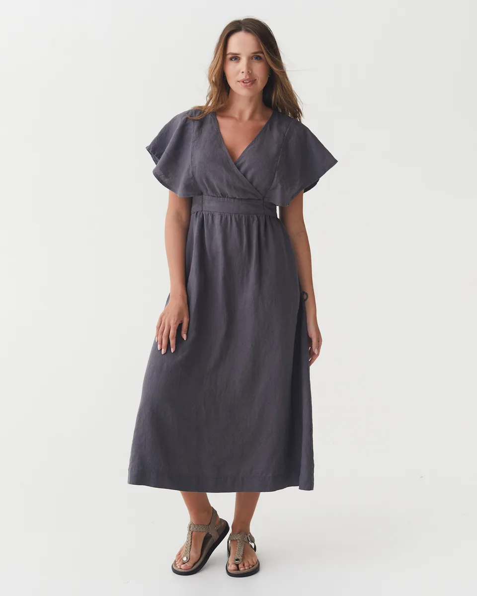 The Linen Wrap Dress YOHO in anthracite blends timeless elegance with everyday comfort. Featuring a flattering wrap top, a gently flared skirt, and a gathered waistline, it offers a graceful silhouette. The adjustable back-tied belt enhances the fit, cinching the waist beautifully. Thoughtfully designed with inseam side pockets, this versatile dress effortlessly transitions from casual outings to special occasions. • Tie-waist fit• V-neck• Midi length• Butterfly sleeves