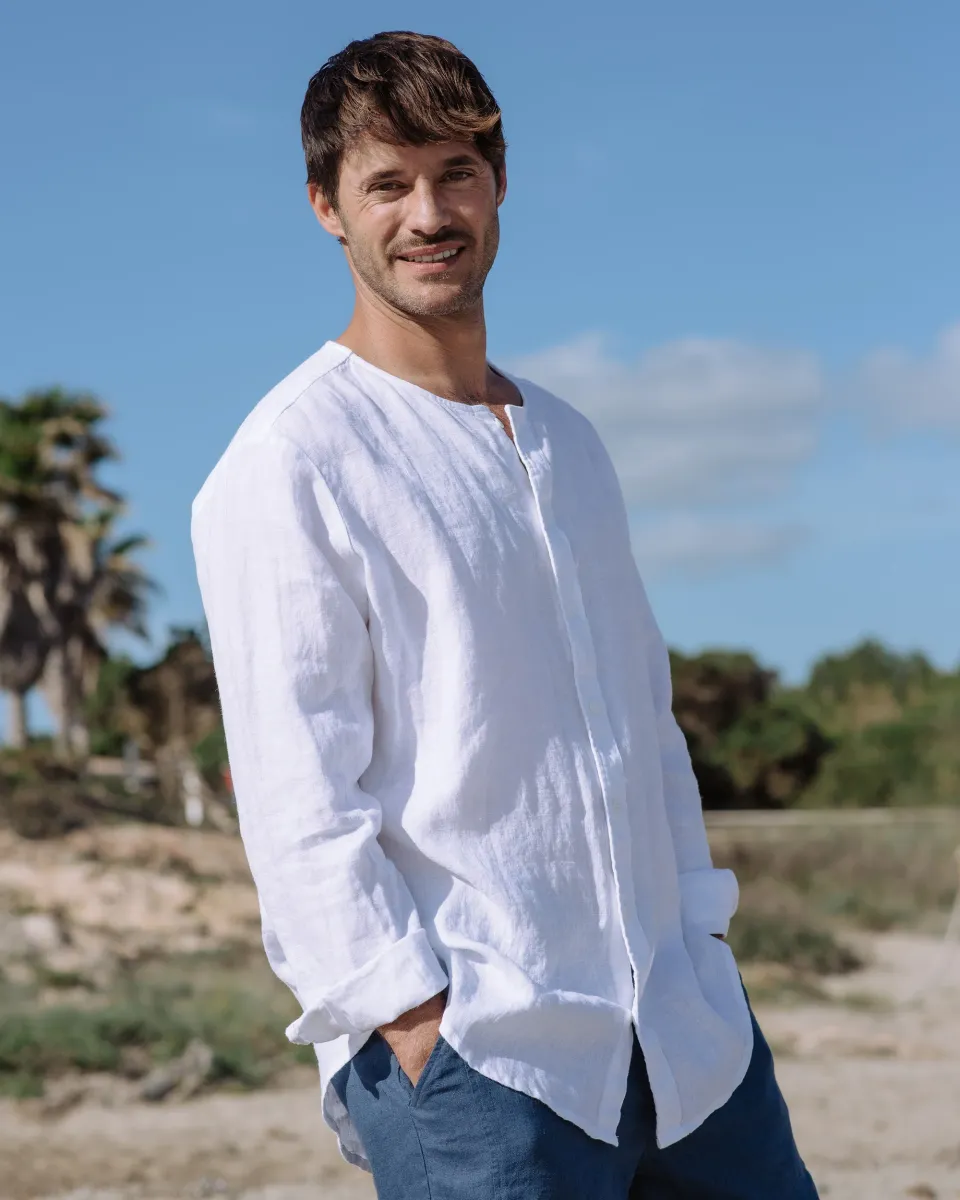 A timeless addition to any wardrobe, the Men's Linen Shirt BEDARRA in White is designed for effortless wear. Crafted from breathable linen, it offers a relaxed fit with a band collar and button-up front. The long sleeves with buttoned cuffs allow for versatile styling—wear them down for a polished look or roll them up for a laid-back feel. Whether paired with linen trousers for a refined outfit or worn casually with shorts, this shirt is a go-to for warm-weather dressing. • Relaxed fit• Hip leng