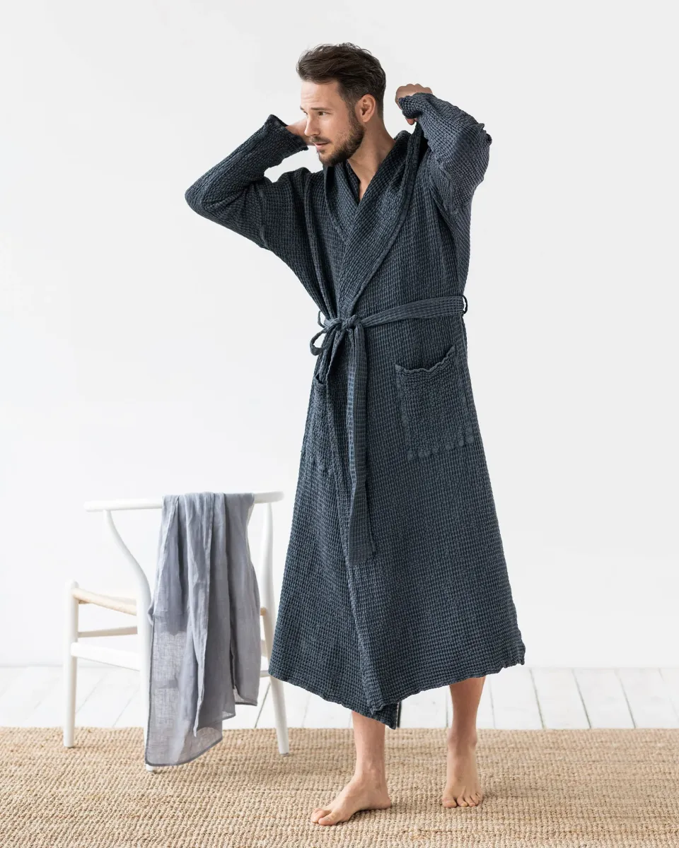 Waffle robe for men in dark gray. This comfortable hooded robe is made from linen-cotton blend, which makes it super soft and lightweight. The puffy waffle weave increases absorbency and gently exfoliates your skin. The robe comes with two pockets and a waist tie. Please note that due to the many variations in monitors and browsers, actual colors may vary.
