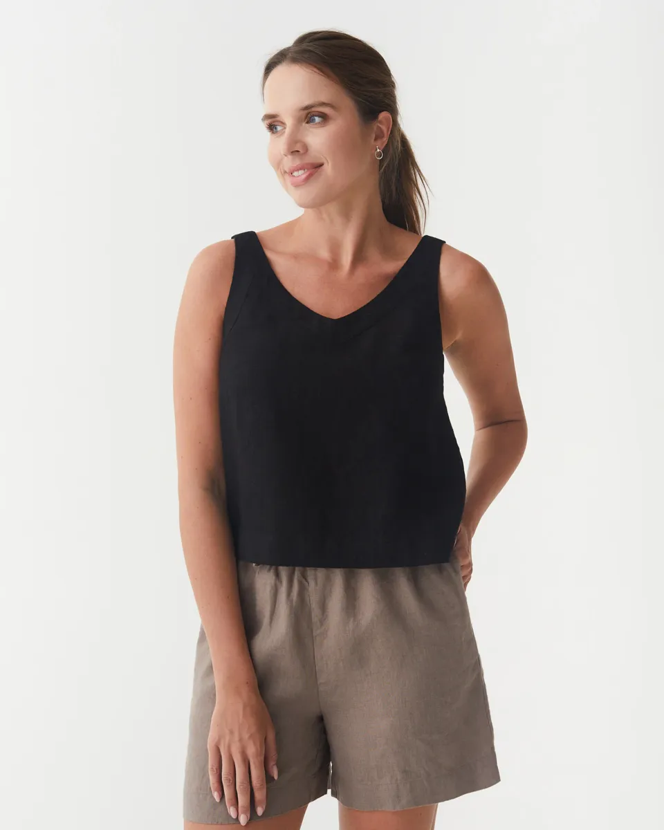 The Sleeveless Linen Top DOURO in Black is a timeless wardrobe staple. Featuring a flattering V-neckline and a relaxed fit, this top is perfect for warm days or layering under your favorite jacket. The breathable linen fabric ensures all-day comfort, while the minimalist design makes it easy to pair with any outfit. • Relaxed fit• V-neck• Hip length• Sleeveless/wide straps