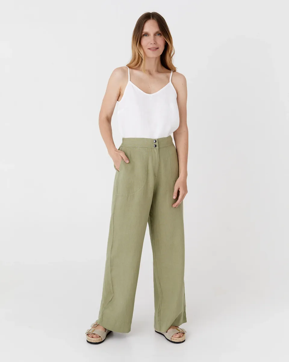 Summer classics. Wide linen pants BANFF are here to save you during hot summer days in the city. Elasticated waist, regular fit, comes in black and white – all these features are making them one of your summer clothing essentials. Add a tucked top, a loose shirt, or a sleeveless blouse and leave your house with confidence. • Elasticated waist • Regular fit • Side pockets • Zipper closure • Medium weight linen (approx. 180 gsm) Please note that due to the many variations in monitors and browsers,