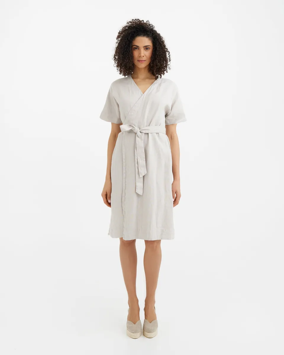 Wrap linen dress PADAR in Natural Flax is made from 100% European flax linen in a structured midweight fabric. The fitted wrap-style bodice features a clean V-neckline and adjustable tie belt for defined waist shaping. Short kimono sleeves and a midi-length skirt with inseam side pockets complete the silhouette. Color & Feel Natural Flax is an undyed oatmeal beige with warm undertones and visible natural fiber variation. Subtle shade differences reflect the inherent character of flax. The li