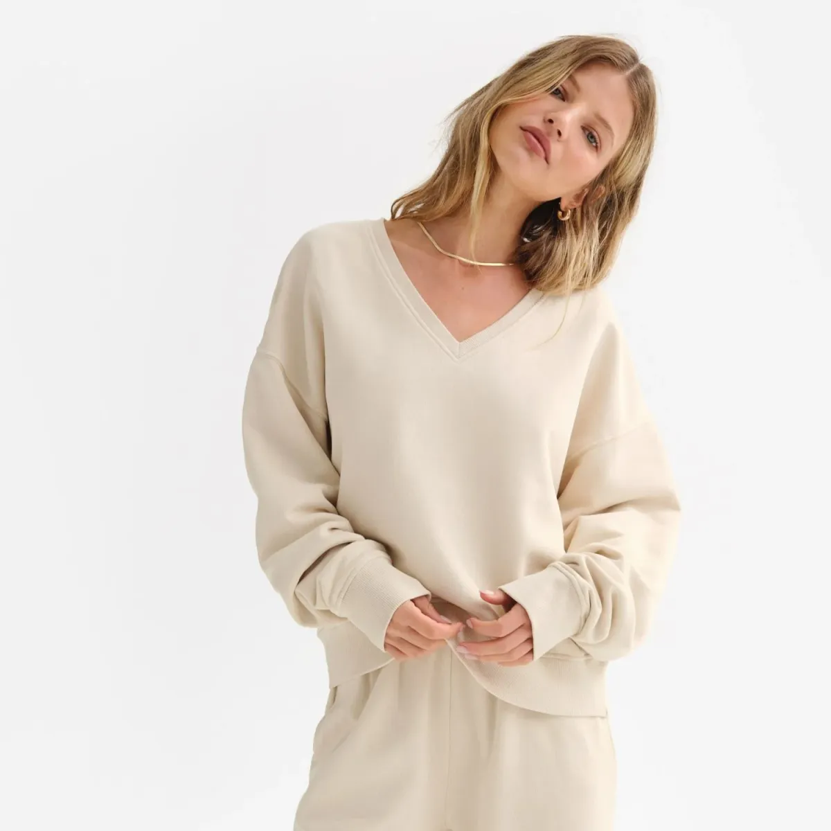 GOTS Certified Organic Fleece V-Neck Sweatshirt. V-Neck sweatshirt with dropped shoulder and easy fit. Rib trim at v-neck, sleeve cuffs and bottom hem.Please note that this garment is dyed in small batches. Due to the unique nature of garment dye, each piece is one of a kind with slight color variations. - 100% Organic Cotton - GOTS Certified Organic Cotton - Machine wash cold with like colors - Tumble dry low - Do not bleach - Made in India Measurements - True to Size - XS : Chest 40 in; Le