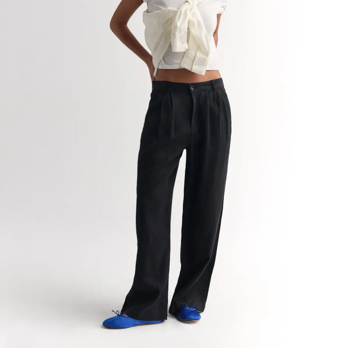 - GOTS Certified Organic Linen Pleated Pant- Relaxed, easy fit; can be worn as a high waist paint or lower rise- Fixed front with pleat detail and elasticated back panel for an easy fit- Side pocketsMade from Organic French Linen, this fabric is naturally breathable, temperature regulating, and gentle on skin. It has a lightly textured hand feel with an easy drape that softens over time, bringing comfort and ease to everyday wear. - Made with 100% Natural Linen - Machine wash cold with like col