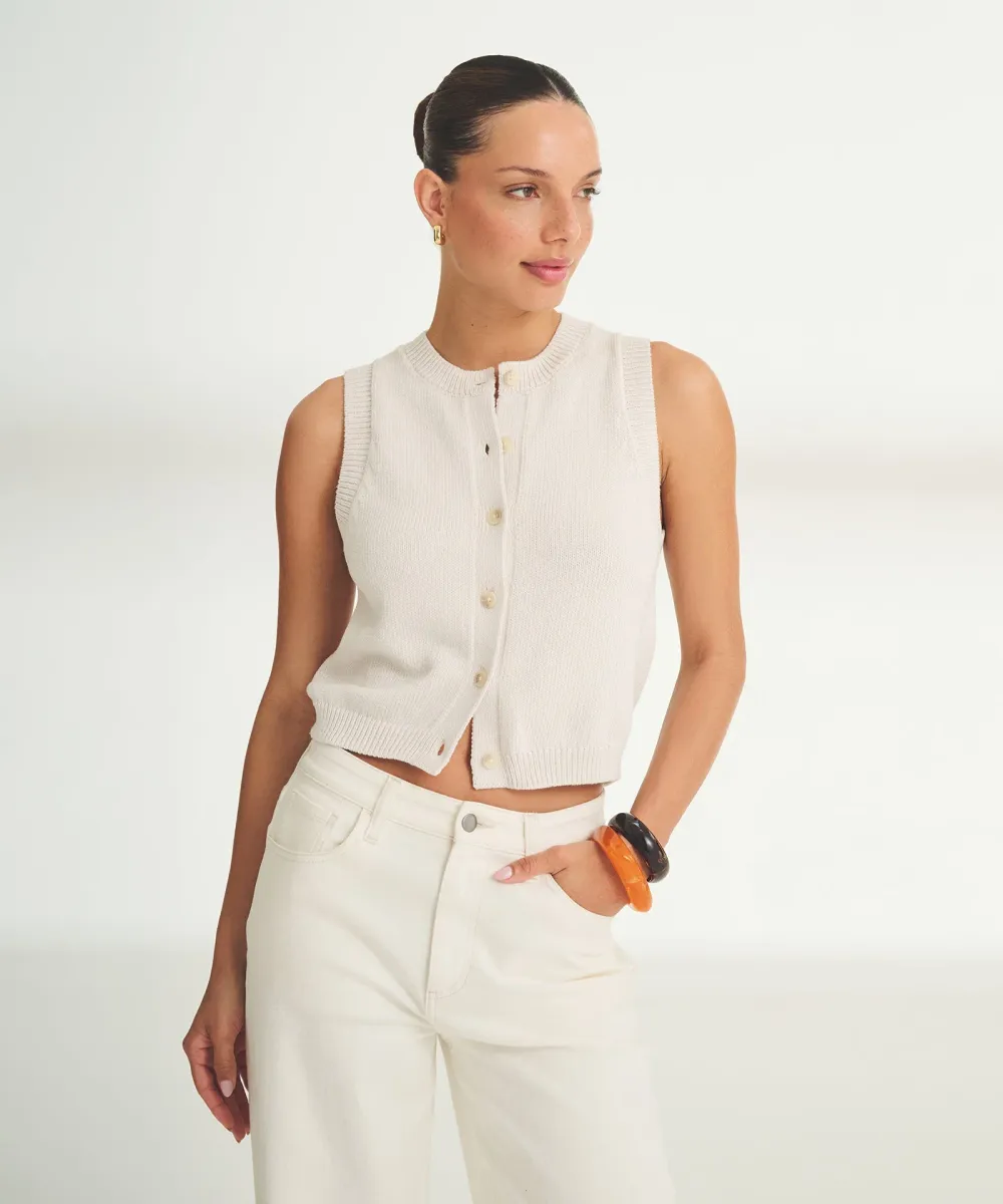 Buttoned up and breezy. The Organic Cotton Sleeveless Cardigan Vest combines the luxury of Organic Tanguis cotton with a sleek silhouette. The classic length hits at the hip, while the button front adds versatility. A naturally breathable layer that works year-round.