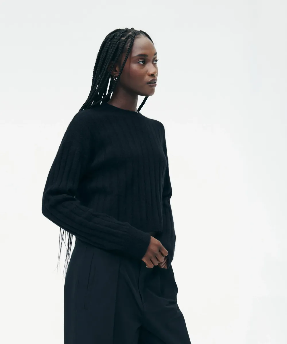The Cashmere Ribbed Cropped Sweater is a versatile wardrobe staple with a relaxed classic fit and a cropped length. It features a crew neckline, drop shoulders, and wide ribbing throughout. Crafted from 100% premium, sustainable cashmere.
